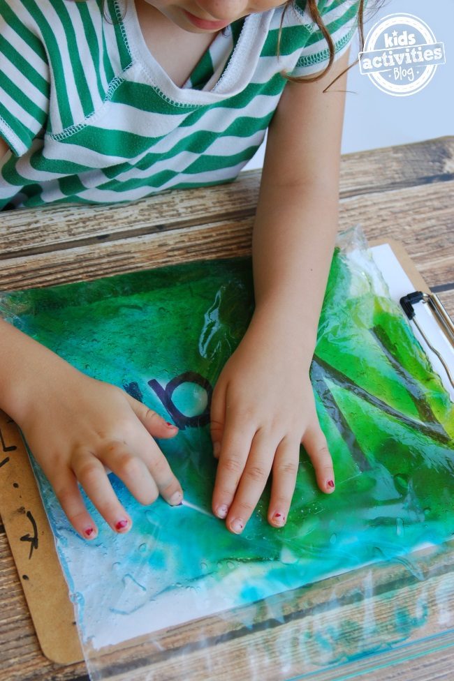 These are brilliant. Fill a giant ziplock bag with about half a bottle of hair gel and some food coloring. To use, write their name on a page. Lay the gel bag over the paper. Your kids trace the letters to make their name.